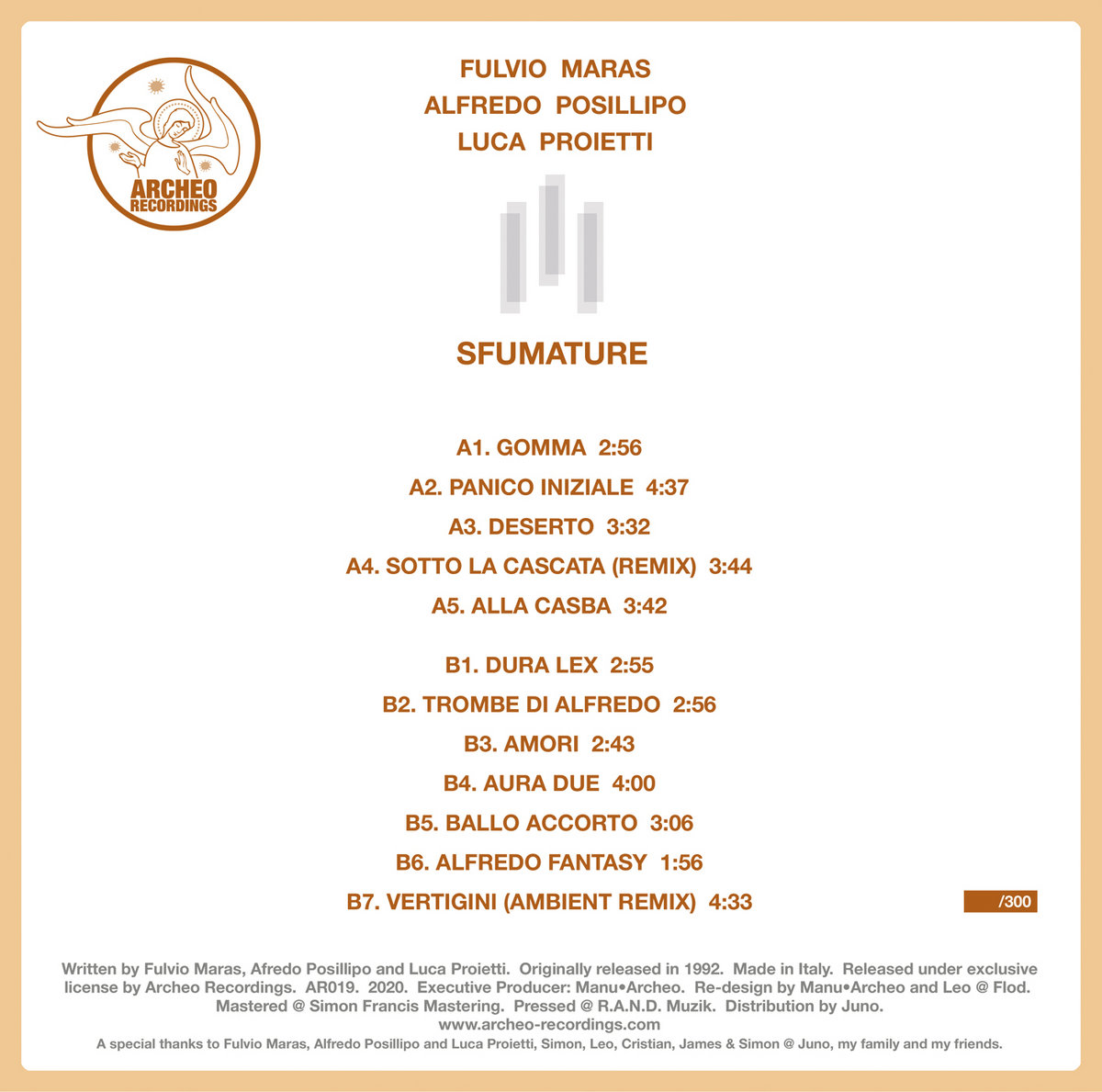 Archeo come through with another stunning relic dusted down from a forgotten corner of Italian music culture. Fulvio Maras, Alfredo Posillipo and Luca Proietti originally released Sfumature back in 1992, and it's quite the spectacle to behold. Minimal synths provide an underlay for the tense sustained pads and Maras' tumbling percussion on "Panico Iniziale", while nimble hand drums spiral around woozy brass and delicate chimes on "Trombe Di Alfredo". The mood gets seductively dreamy on "Amori" thanks in no small part to the double bass playing at its core. Highly accomplished, inquisitive and utterly satisfying music occupying its own unique space.